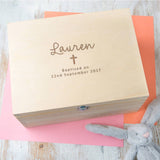 A beautiful and unfussy personalized Baptism keepsake box, fully customized with the details of your choice which can include baby's name and Christening date and well as a selection of symbols. A truly thoughtful baptism gift for a baby girl or boy from their godparents. Fill with photographs and other keepsakes for them to look back and smile when they grow older.